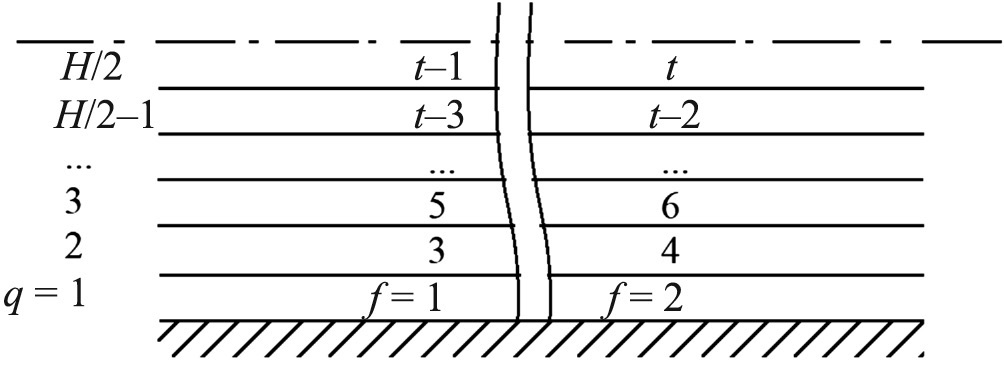 Узлы одного типа f обладают общими физико-химическими свойствами, т.е. между собой они образуют однородную область. Под общий тип f объединяются узлы, которые имеют одинаковое структурное окружение, например, удаленность от стенки поры. В случае однородной поверхности стенок пор и однофазного состояния флюида все узлы одного монослоя q имеют одинаковую плотность, т.е. имеют один и тот же тип f. В настоящей работе рассматривается однородная поверхность стенок пор и двухфазное состояние флюида в поре (см. рис. 1) (без рассмотрения переходной области между “паром в поре” и “жидкостью в поре”), в которой число типов узлов f в монослое удваивается, так что плотность отличается со стороны “пара в поре” и со стороны “жидкости в поре”. В итоге, общее число типов узлов в системе N равно удвоенному числу монослоев между стенкой поры и центром поры: N = H.