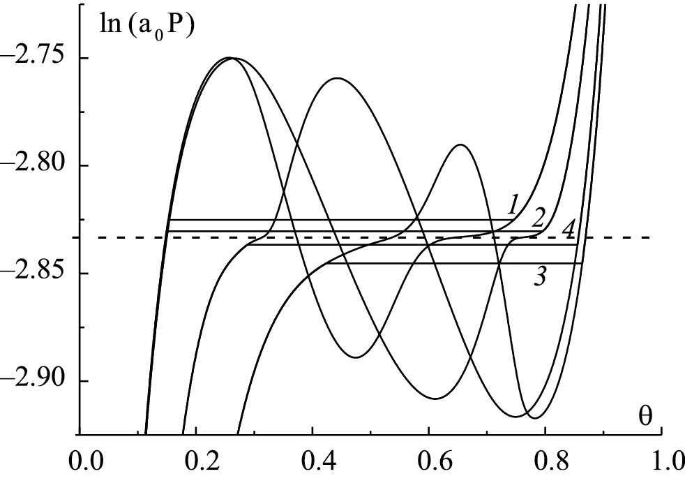 На рис. 2 показаны изотермы адсорбции аргона в щелевидной поре шириной H = 40 (кривые 1 и 3) и 100 (2 и 4) и потенциалом стенок пор Q = 0 (1 и 2) и 5 (3 и 4). Для каждой изотермы адсорбции поперек петли Ван-дер-Ваальса сплошной линией проведена своя секущая Максвелла. Данные секущие устанавливаются на уровне химического потенциала, отвечающего давлению насыщенного пара в поре Ps(H,Q) для заданных H и Q. На рис. 2 также пунктирной линией отмечен химический потенциал, соответствующий давлению насыщенного пара в объеме Ps(bulk).