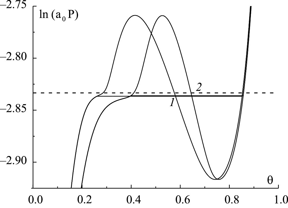 Состояния фаз “жидкость в поре” и “пар в поре”, и в частности, локальные плотности в узлах f, θf определяются согласно условию, что обе “фазы в поре” находятся в химическом равновесии с насыщенным паром в объеме, что соответствует исходному определению расклинивающего давления [1]. Состояние насыщенного пара в объеме определяется по положению секущей Максвелла относительно изотермы для химического потенциала (см. работы [8, 15]).