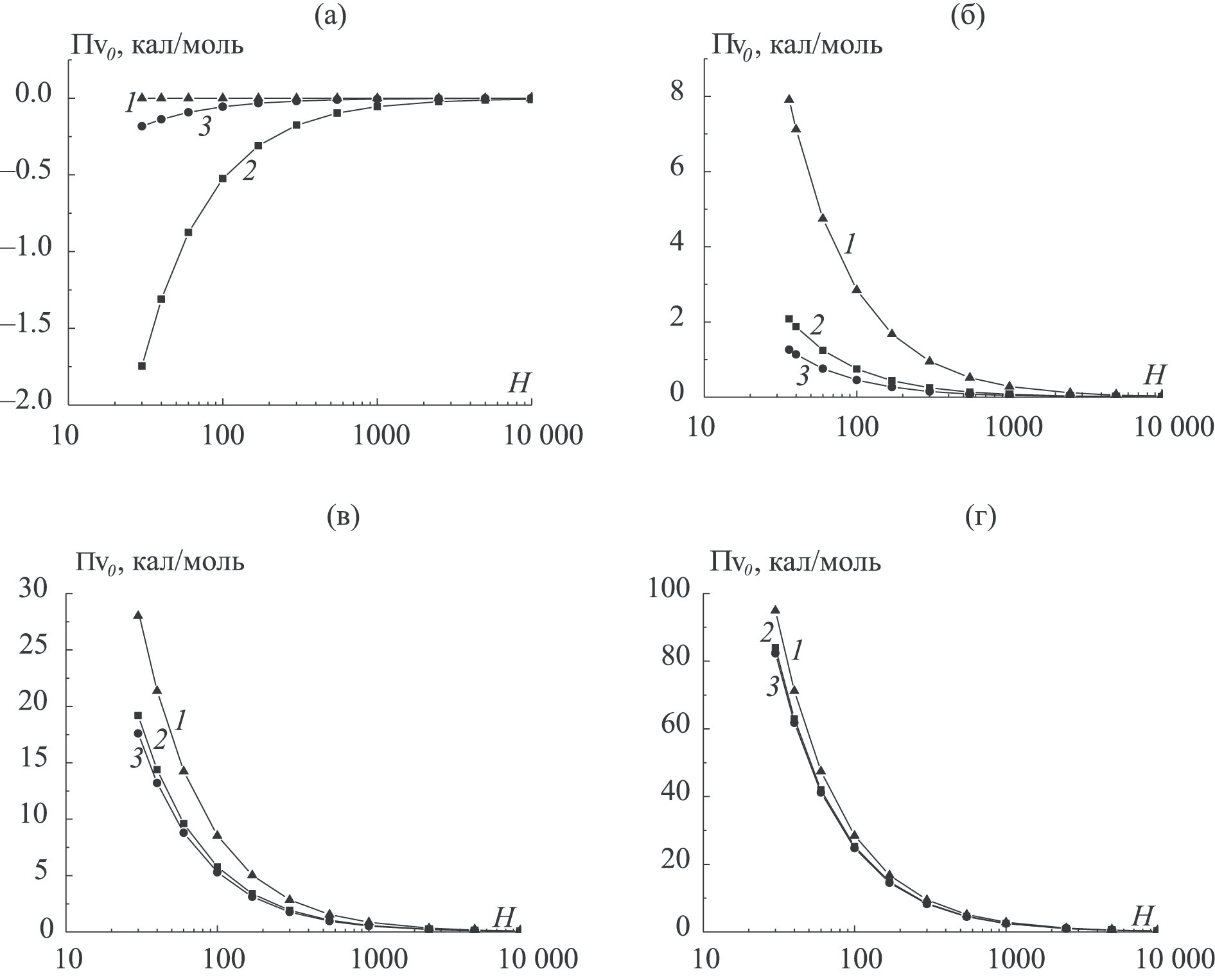 На рис. 7 приведены изотермы расклинивающего давления П в щелевидной поре (т.е. размерные зависимости П от ширины щелевидной поры Н) по определениям через химический потенциал П(μ) (кривая 1), через внутреннее давление в жидкости П(π|L) (2) и через внутреннее давление в паре П(π|V) (3). Ширина щелевидной поры Н варьируется от минимального значения Нmin = 30 до макроскопического Нmacro = 104, при котором расклинивающее давление обращается в ноль, при потенциале стенок пор Q = 0 (рис. 7а), 0.5 (рис. 7б), 1.5 (рис. 7в) и 5 (рис. 7г).