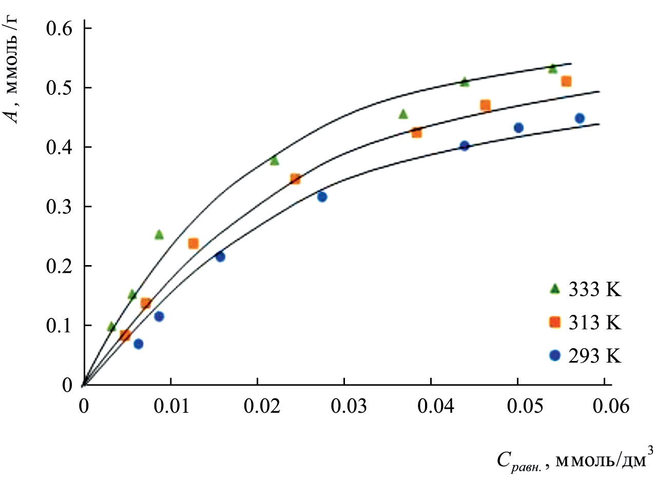 Как видно из представленных данных (рис. 1), адсорбция ионов увеличивается с ростом температуры. При 293 К величина адсорбции ионов меди(II) составила 0.447 ммоль/г (28.4 мг/г), а при 333 К составила 0.531 ммоль/г (33.7 мг/г). Известно, что процесс адсорбции является экзотермическим [14]. Рост величины адсорбции с ростом температуры можно объяснить активацией процесса адсорбции ионов меди(II).