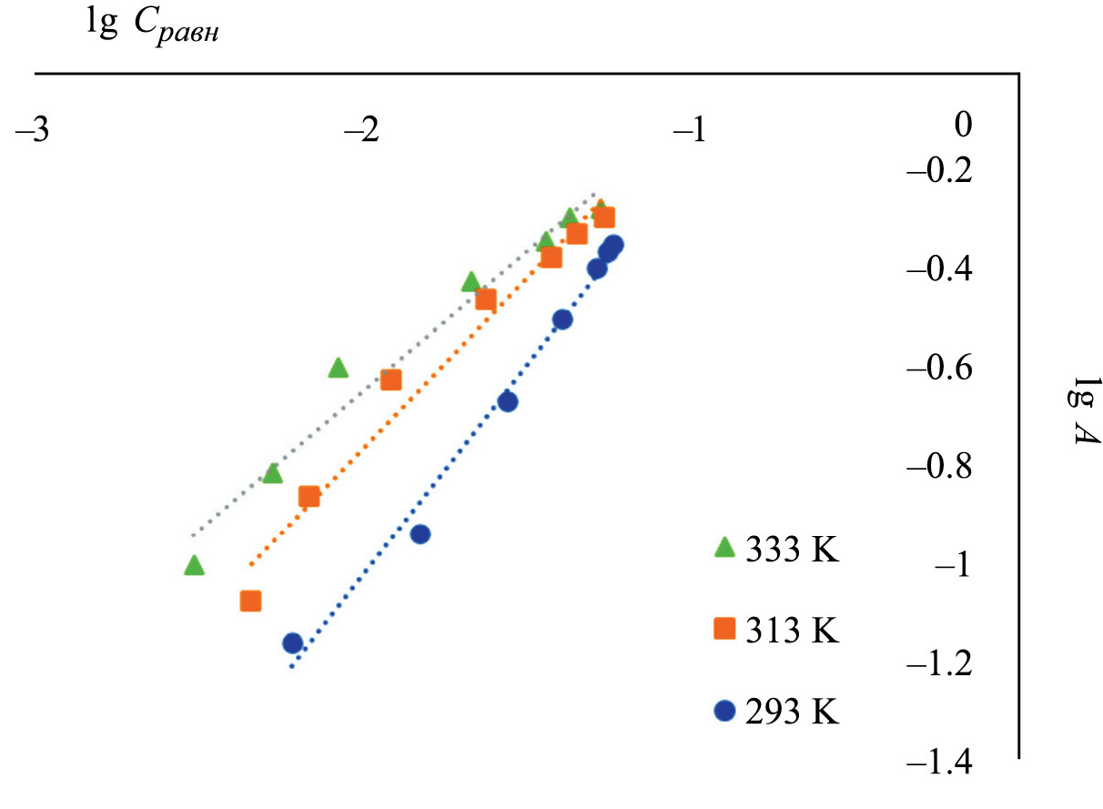 Из графических линейных зависимостей (рис. 2) по величине отрезка прямой, пересекающейся с осью ординат, определяли предельную величину адсорбции А∞, а по тангенсу угла наклона прямой – константу адсорбционного равновесия K, значения которых приведены в табл. 2.