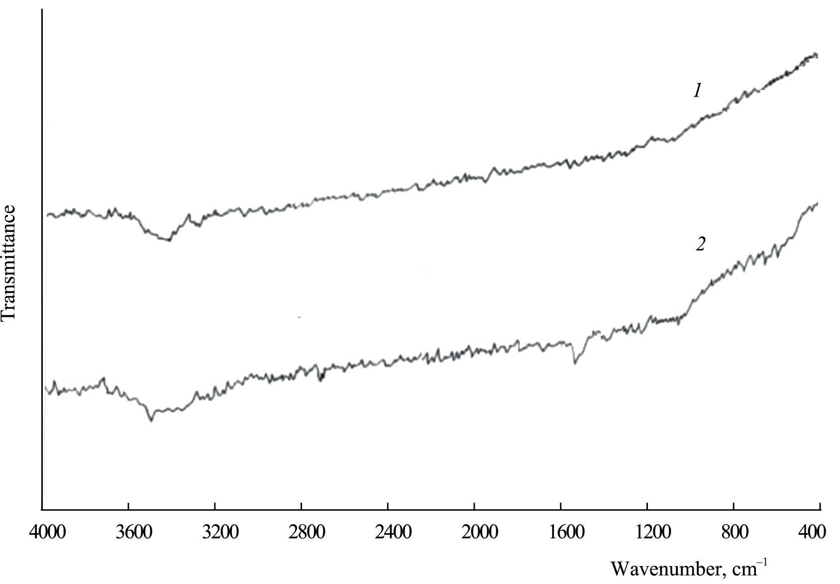Рис. 4. ИК-спектры: 1 – исходный сорбент АД-05-2; 2 – сорбентАД-05-2-Cu после адсорбции меди(II).