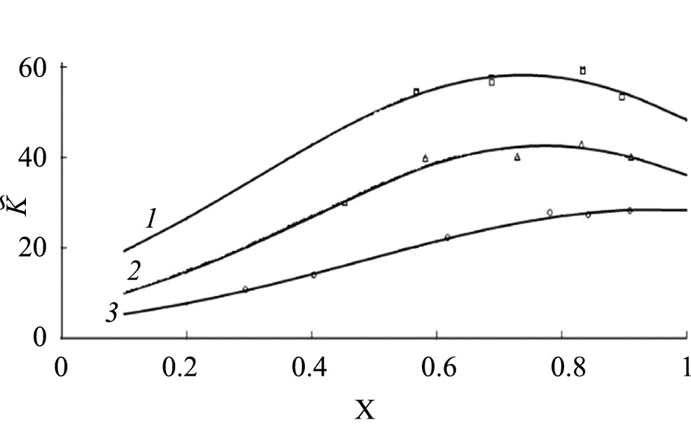Исправленные коэффициенты равновесия, соответствующие уравнению (11) и входящие в уравнения (17) и (18), зависят от состава ионита. Вид таких зависимостей для сорбции комплексных ионов никеля (II) приведен на рис. 2. Исправленный коэффициент равновесия монотонно возрастает при всех температурах до степени заполнения ионита 0.7–0.8, затем происходит снижение его величины. Уменьшение , вероятно, объясняется ростом количества достаточно крупных комплексных ионов в ионите, что приводит к экранированию функциональных групп и затруднению дальнейшего протекания ионного обмена.