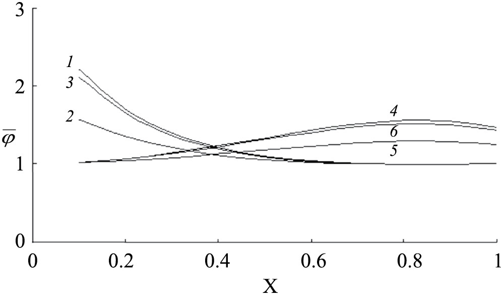 Рис. 3. Зависимость коэффициентов активности резинатов от степени заполнения ионита 1, 2, 3 – [CuGlu]± при 298, 318 и 338 К соответственно, 4, 5, 6 – Na+ при 298, 318 и 338 К соответственно.