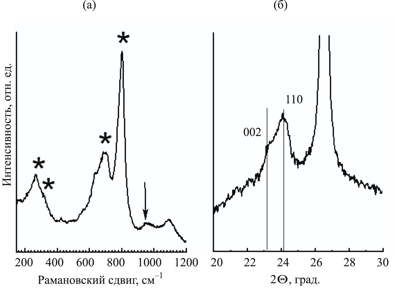 Представительный рамановский спектр представлен на рис. 1а. Согласно литературным данным [36], линии 265, 313, 696, 797 см–1 относятся к деформационным и валентным колебаниям W–O–W в моноклинном WO3. Отметим, что самая интенсивная полоса около 800 см–1 вероятно состоит из двух компонент с максимумами 781 и 804 см–1. Известно [41], что положения пиков в спектрах триоксида вольфрама могут зависеть от деталей синтеза образца, что отражает дефектность структуры. Ряд слабых полос, среди которых самой сильной является 954 см–1, относятся к колебаниям связи W=О в гидратированном триоксиде вольфрама.