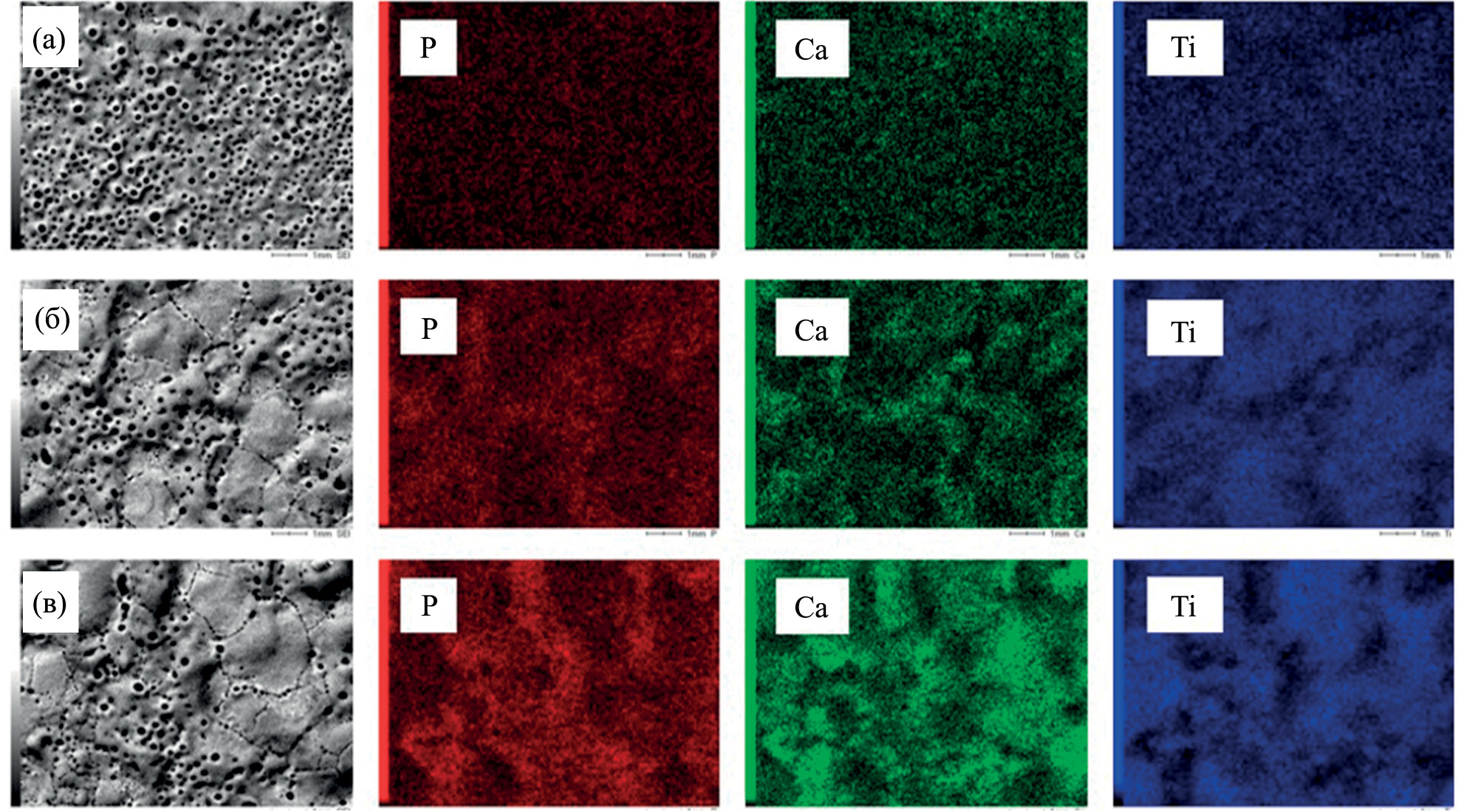 На рис. 3 представлены EDX-карты распределения элементов по поверхности полученных покрытий. На поверхности образцов после ПЭО наряду с Тi идентифицируются Сa и P, что свидетельствует о включении этих элементов в структуру оксидного слоя.