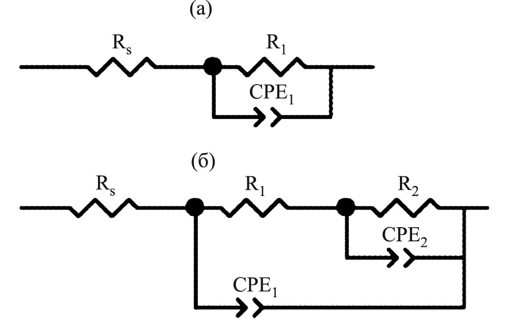 Для количественного описания полученных спектров импеданса использовали эквивалентные схемы, изображенные на рис. 7. В предложенных схемах применяли элемент постоянной фазы (СPE), который используется для описания коррозионных процессов материалов со значительной неоднородностью и шероховатостью поверхности [23–25]. Импеданс CPE выражается формулой: