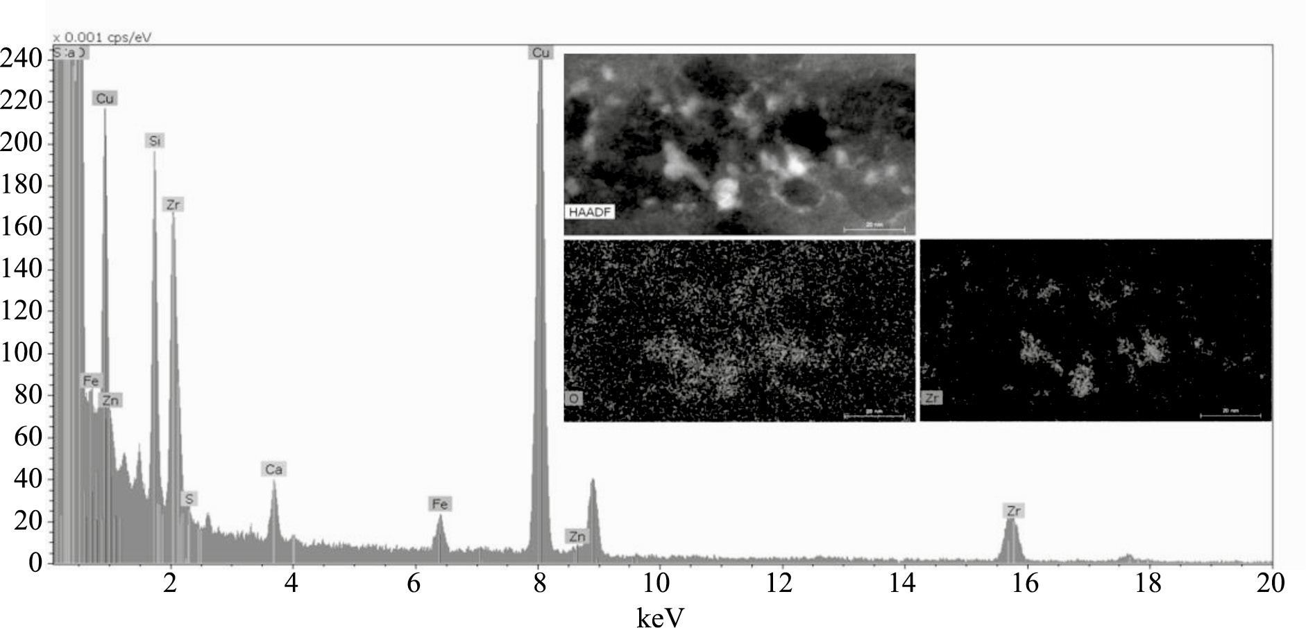 Как было сказано ранее, улучшенный перенос протонов достигается за счет наличия в нановолокнах равномерно распределенных частиц ZrOx. На рис. 5 приведены HAADF-изображение волокна с картами распределения циркония и кислорода в нем и соответствующий участку ЭДС-спектр.