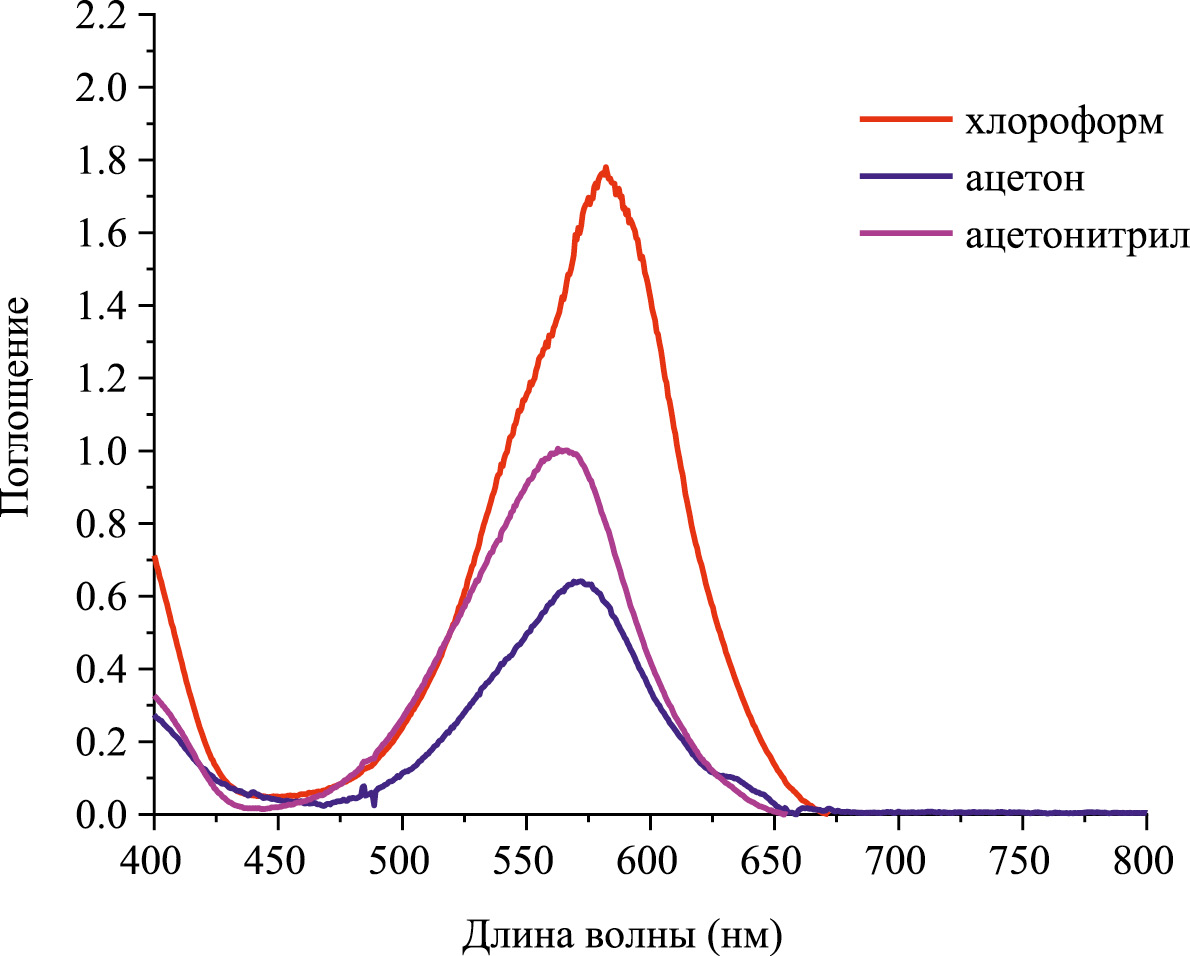 Известно, что растворители влияют на физико-химические и фотофизические характеристики соединений, в частности, на интенсивность флуоресценции. Оптическое поглощение спиропирана I в закрытой и открытой формах исследовали в хлороформе, ацетоне и ацетонитриле (рис. 3). Очевидно, что при увеличении полярности растворителя полоса поглощения открытой формы фотохрома претерпевает гипсохромный сдвиг, что свидетельствует об отрицательном сольватохромизме. Предполагается, что в основном состоянии молекула находится в цвиттер-ионной мероцианинофой форме с полным разделением зарядов, которая при возбуждении трансформируется в нейтральную за счет внутримолекулярного зарядового переноса. Гипсохромный сдвиг обусловлен стабилизацией основного состояния соединения Ι за счет сильного ион-дипольного взаимодействия между молекулами спиропирана и высокополярного растворителя, сольватирующего зарядонесущие центры цвиттер-иона.
