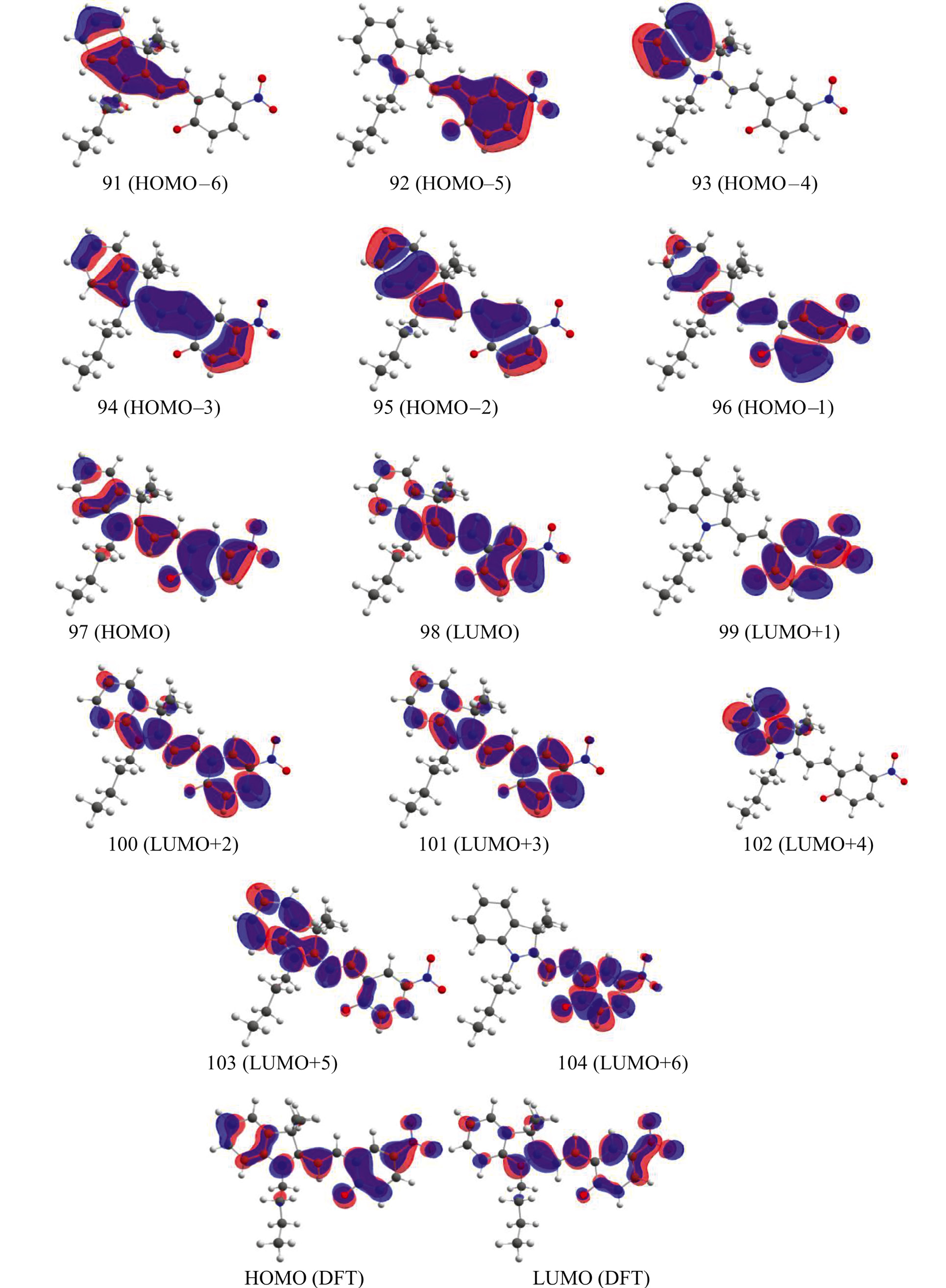 На рис. 4 представлены МО активного пространства SA-CASCF(14,14,5)/сс-pVTZ (91–104) и орбитали, задействованные в первом электронном переходе, рассчитанном с помощью метода DFT/def2-TZVP (HOMO(DFT) и LUMO (DFT)). Очевидно, что молекулярные орбитали 97 и 98 имеют структуру, сходную с НОМО и LUMO орбиталями, задействованными в DFT. Это свидетельствует о том, что метод DFT может качественно предсказывать верное распределение электронной плотности в молекуле спиросоединений и природу электронного перехода, обеспечивающего окраску мероцианиновой формы.