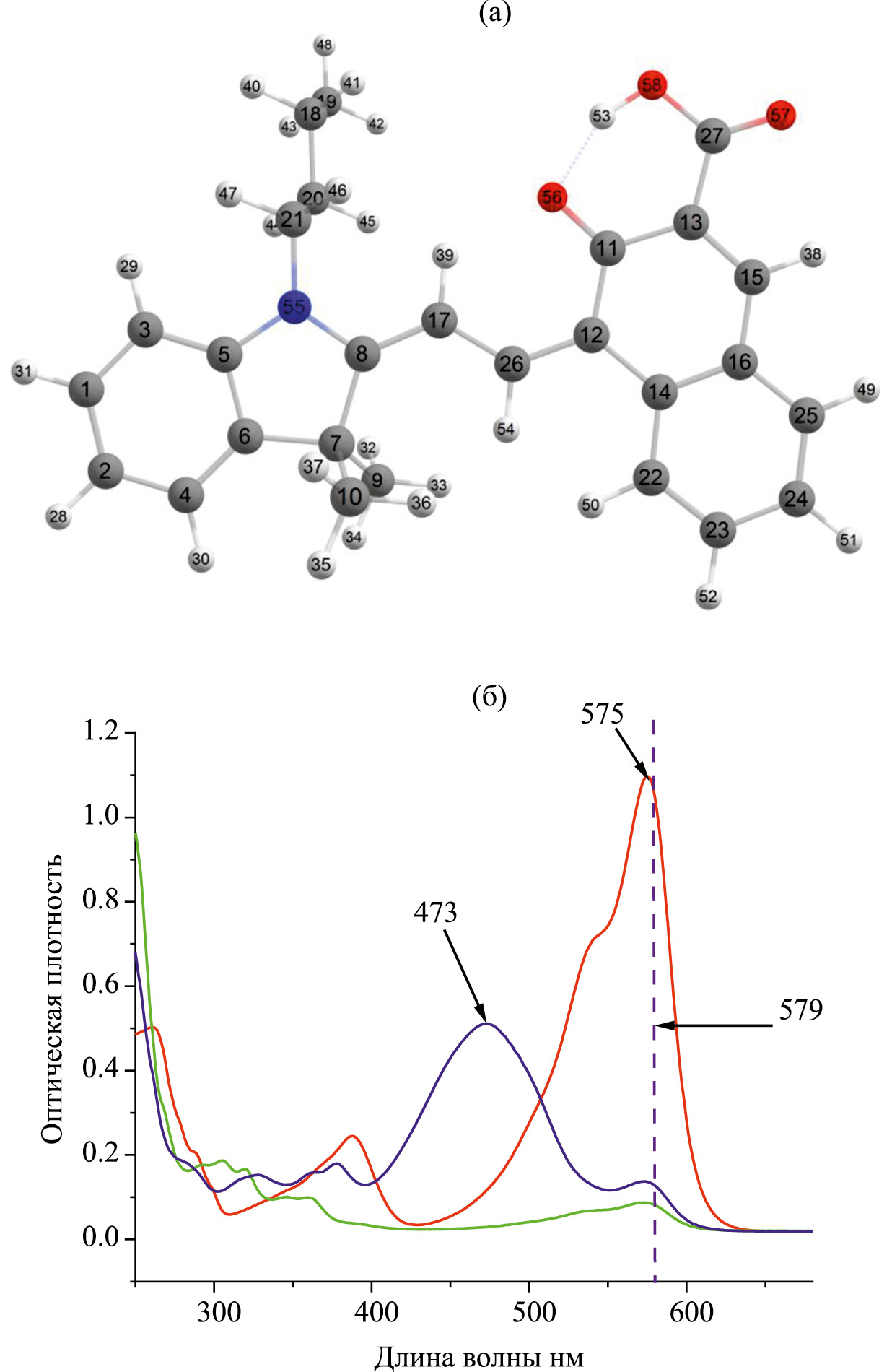 Расчетные и наблюдаемые значения максимумов поглощения мероцианина в видимой области представлены в табл. 2; скорректированные длины волн (λcorr) получены с помощью линейной регрессии [43].