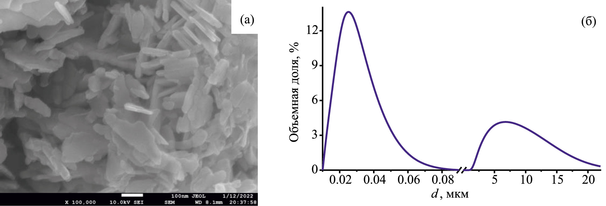 После выделения порошков из суспензий на аппарате нанораспылительной сушки частицы представляют собой аморфную фазу гидроксида цинка. Для образования фазы оксида цинка их выдерживали при температуре 350 °С. На рис. 1 представлены РЭМ-изображения частиц порошка оксида цинка после термообработки и кривая распределения частиц по размерам, полученная методом лазерной дифракции. Частицы имеют выраженную пластинчатую морфологию (рис. 1а) с размерами от десятков до сотен нанометров. Согласно бимодальному распределению (рис. 1б), данный порошок представляет собой смесь изолированных частиц и агрегатов со средним размером 30 нм и 7 мкм, и объемным соотношением 4:1, соответственно.