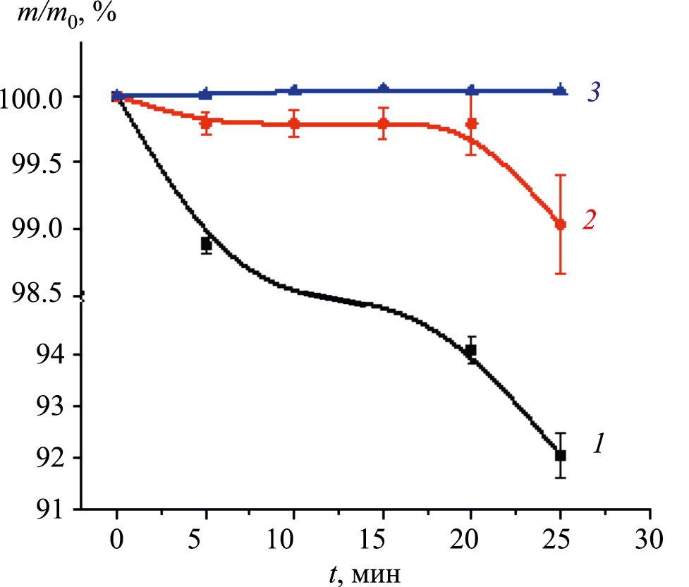 Образец стали без покрытия теряет 1,2% массы в течении первых 5 мин (кривая 1, рис. 3), что связано с растворением поверхностного слоя, включающего оксидную пленку, а затем скорость растворения повышается и составляет в среднем 0,34%/мин. Полимерное покрытие закономерно приводит к усилению коррозионной защиты (кривая 2, рис. 3) и существенное увеличение скорости расворения металла наблюдается только через 20 минут, что связано с частичным отслоением покрытия. Добавление НЧ ZnO усиливает защитные свойства покрытия (кривая 3, рис. 3). На всем временно́м участке наблюдается незначительное увеличение массы образцов У8А–АЛ–ZnO, что может быть вызвано диффузией растворителя в объем полимрной матрицы и образованием продуктов коррозии внутри нее и на межфазной границе.
