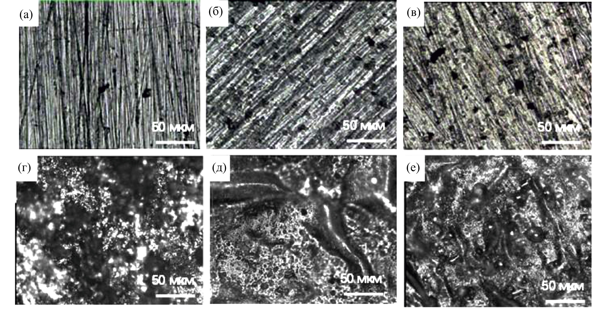 Рис. 5. Оптические изображения поверхность стали У8А до (а, б, в) и после (г, д, е) травления: а, г – У8А; б, д – У8А–АЛ; в, е – У8А–АЛ–ZnO.