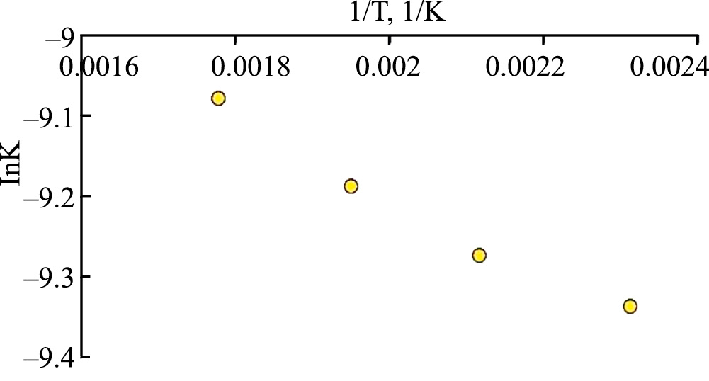 Рис. 6. Аррениусовская зависимость логарифма константы скорости конверсии метанола на адсорбенте АСМ 1 в диапазоне 160°–290°С при скорости потока 400 мл/мин.