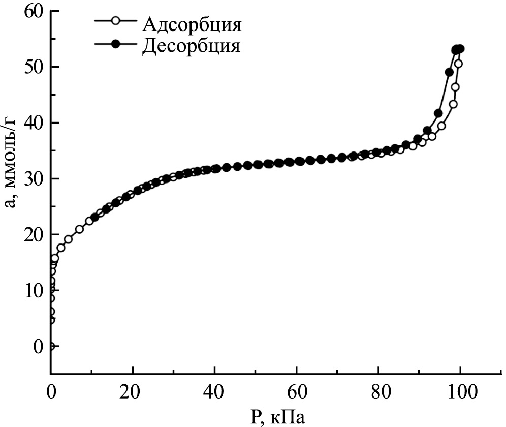 Перед измерениями адсорбент регенерировали в вакууме при температуре 250оС и давлении 0.001Па. Как следует из рис.1 изотерма адсорбции-десорбции азота при 77К в начальной области заполнения микропор обратима, но при высоких заполнениях имеет петлю гистерезиса, свидетельствующую о наличии в структуре адсорбента мезопор. Результаты определения СЭХ адсорбента по Теории объемного заполнения микропор Дубинина (ТОЗМ) [8] и БЭТ [10] представлены в табл. 1.