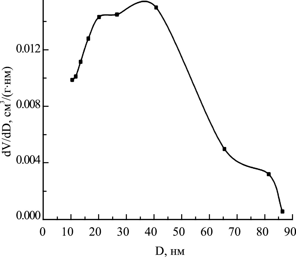 Как следует из рис. 2, в структуре адсорбента ФАС-097 имеются несколько максимумов: узкий максимум при 0.8 нм и широкий (1.3–1.8) нм, попадающих в интервал оптимальных структур по ТОЗМ при Х0 = 1.64 нм. Такого рода структура адсорбента создает возможность для эффективной сорбции пропана в системах разделения и аккумулированания. Распределение мезопор по размерам определяли методом BJH. Результаты представлены на рис. 3.