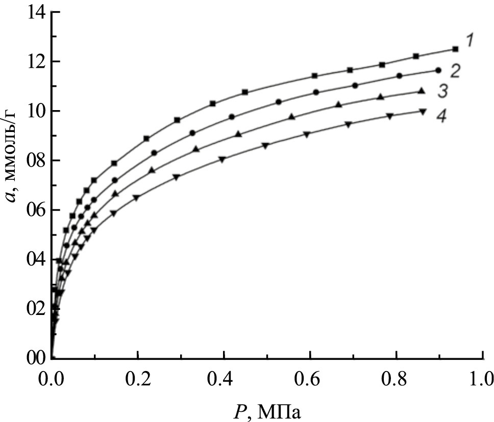 Как следует из рис. 4, адсорбция пропана на адсорбенте ФАС-097 растет с ростом давления и падает с ростом температуры, отсутствуют скачкообразные изменения, характерные для фазовых переходов. В области давлений до 0.1 МПа подъем изотерм наиболее крутой. В этой области происходит наиболее интенсивное заполнение микропор, и адсорбция пропана при температуре 303 К достигает значения ~12 ммоль/г (53 мас.%), а при температуре 333 К, около ~9 ммоль/г (~44 мас.%). При дальнейшем заполнении рост адсорбции замедляется, и проявляется тенденция к насыщению.