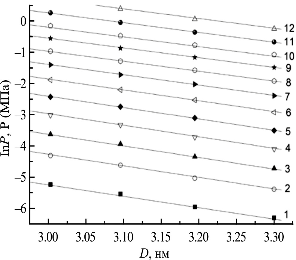 Как следует из рис. 5 изостеры адсорбции хорошо аппроксимируются линейными функциями во всем интервале температур. Линейность изостер часто встречающееся свойство при адсорбции газов и паров на микропористых адсорбентах [19–21]. Свойство линейности изостер адсорбции характеризует особое, нанодиспергированное состояние (НДС) адсорбата в микропорах. При этом на энергетику межмолекулярного взаимодействия адсорбированных молекул с адсорбентом накладывается энергетика взаимодействия адсорбированных молекул, существенно из меняющем свойства адсорбированного вещества.