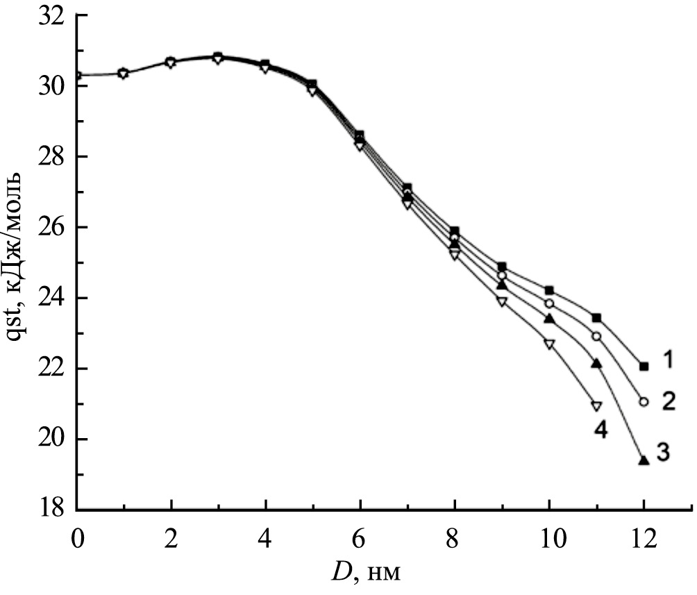 Энергетика адсорбционного процесса отражает особенности взаимодействий “адсорбент-адсорбат” и межмолекулярных взаимодействий в адсорбате. По определению [16], дифференциальная мольная изостерическая теплота адсорбции qst является разностью мольной энтальпии газовой фазы hg и дифференциальной мольной изостерической энтальпии адсорбционной системы Hl