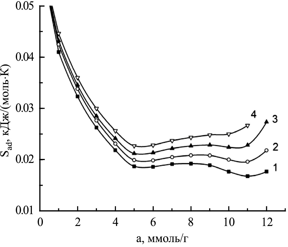 Как следует из рисунка 7, в области заполнения объема микропор до ~5 ммоль/г происходит резкое уменьшение энтропии системы за счет адсорбции молекул на высокоэнергетических центрах адсорбции преимущественно в микропорах 1-й моды. В области заполнений микропор больше 5 ммоль/г, после “полной отработки” высокоэнергетических адсорбционных центров, в микропорах 1-й моды, снижение замедляется и наблюдается уполаживание зависимости Sad от a в интервале 5–10 ммоль/г, что может быть связано с образование адсорбционных ассоциатов пропана в микропорах. В области самых высоких заполнений микропор, при а > 10–11 ммоль/г энтропия адсорбционной системы резко возрастает. Это явление в [23, 24] объясняется изменением структуры ассоциатов в микропорах, обусловленного проявлением комплекса энергетических взаимодействий “адсорбат-адсорбент” и “адсорбат-адсорбат” на малых расстояниях при высоких заполнениях микропор.