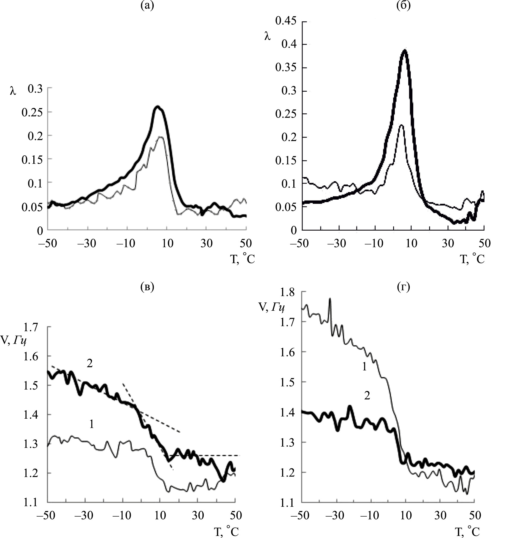 Рис. 4. Эффект фталоцианината на интенсивность α-релаксации λ (а, б) и частоту колебательного процесса ν (в, г) для свободных пленок А (а, в) и М (б, г): кривые 1 – с модификатором; кривые 2 – без него.