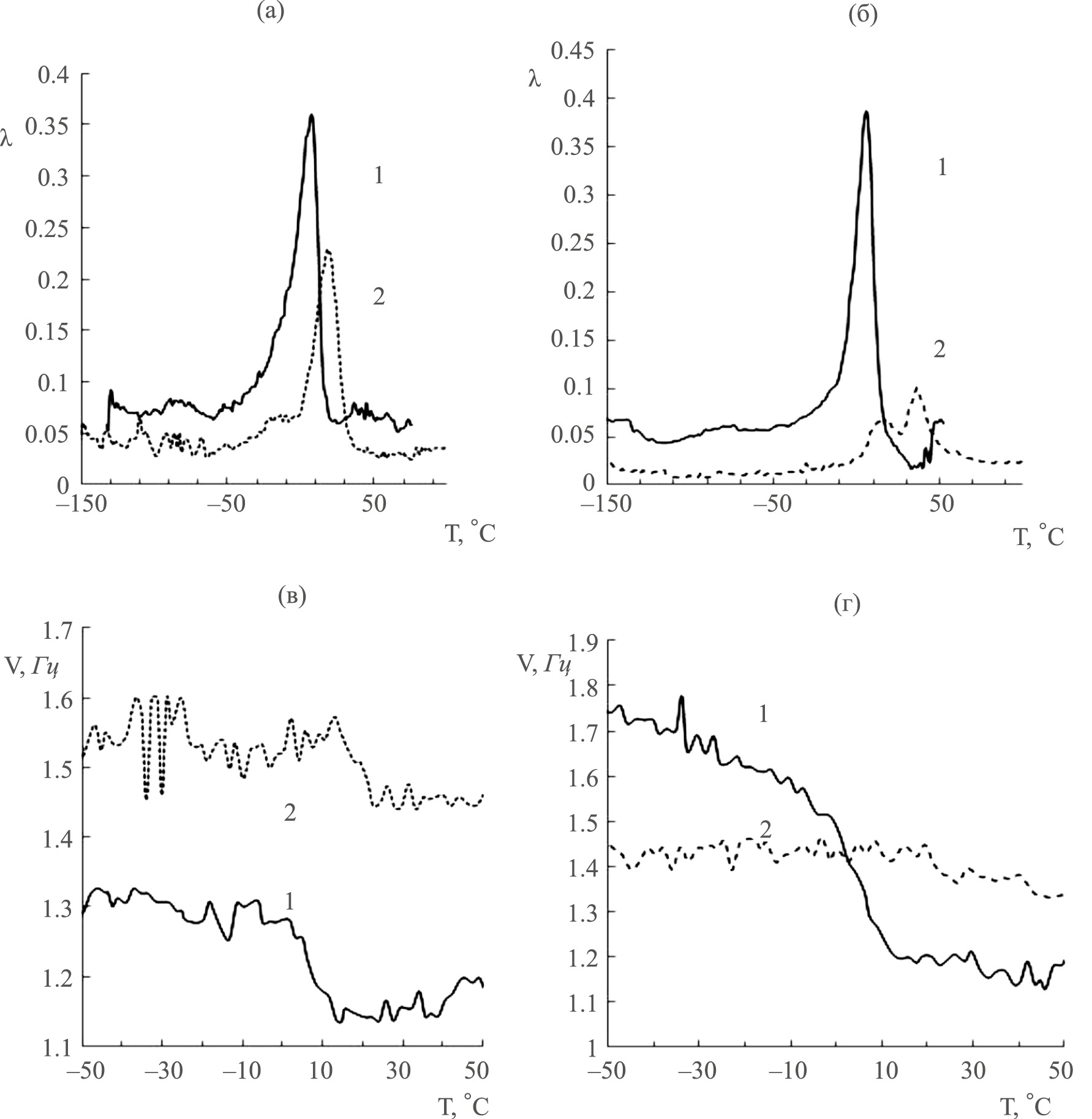 Рис. 5. Эффект подложки на интенсивность α-релаксации λ (а, б) и частоту колебательного процесса ν (в, г) для пленок (кривые 1) и покрытий (кривые 2) полимеров АКР (а, в) и МБМ (б, г) в отсутствии фталоцианината.