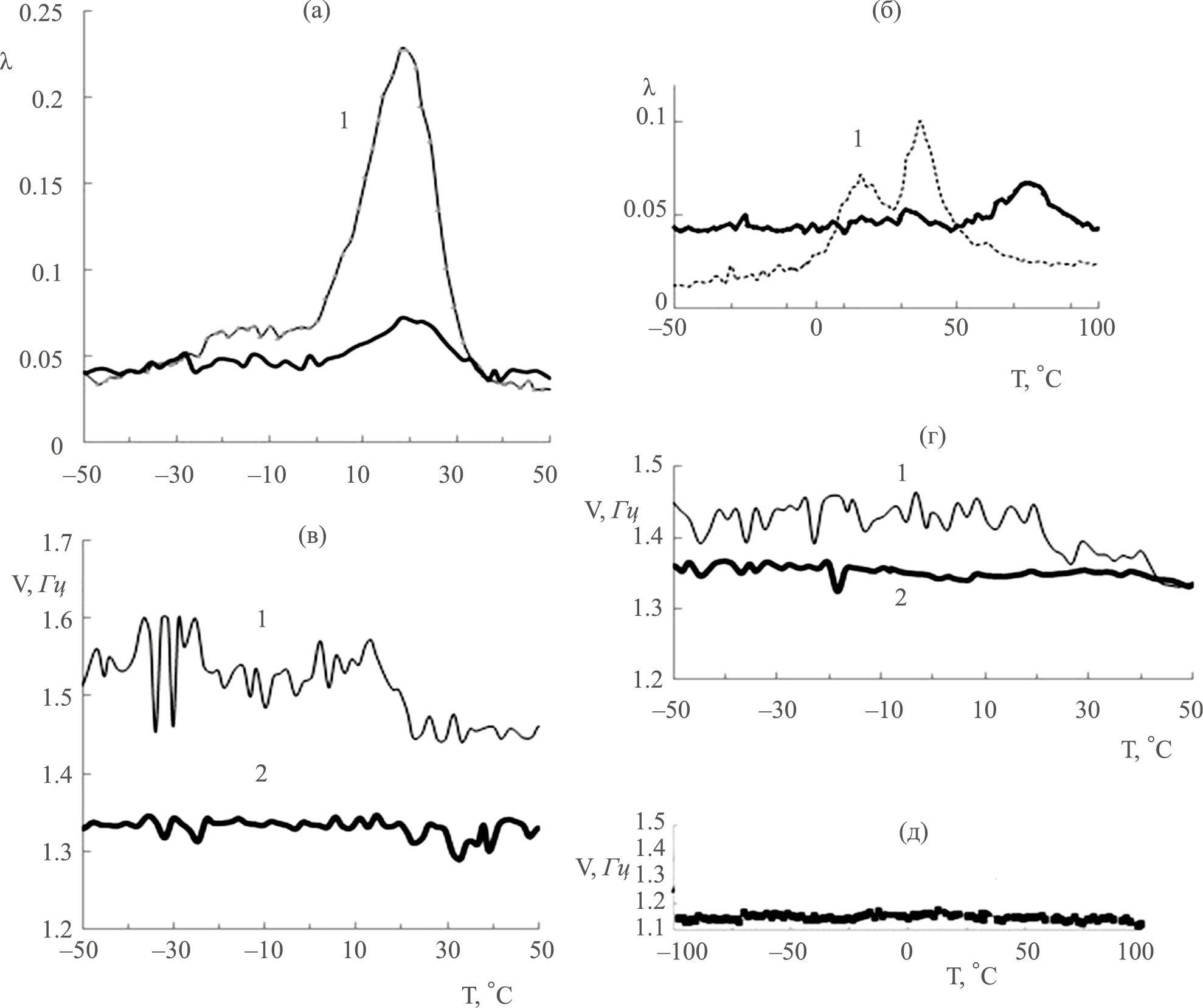 Рис. 6. Эффект фталоцианината на интенсивность α-релаксации λ (а, б) и частоту колебательного процесса ν (в, г) для покрытий А (а, в) и М (б, г): кривые 1 – с фталоцианинатом; кривые 2 – без него. (д) Частота затухающего колебательного процесса в медной подложке.