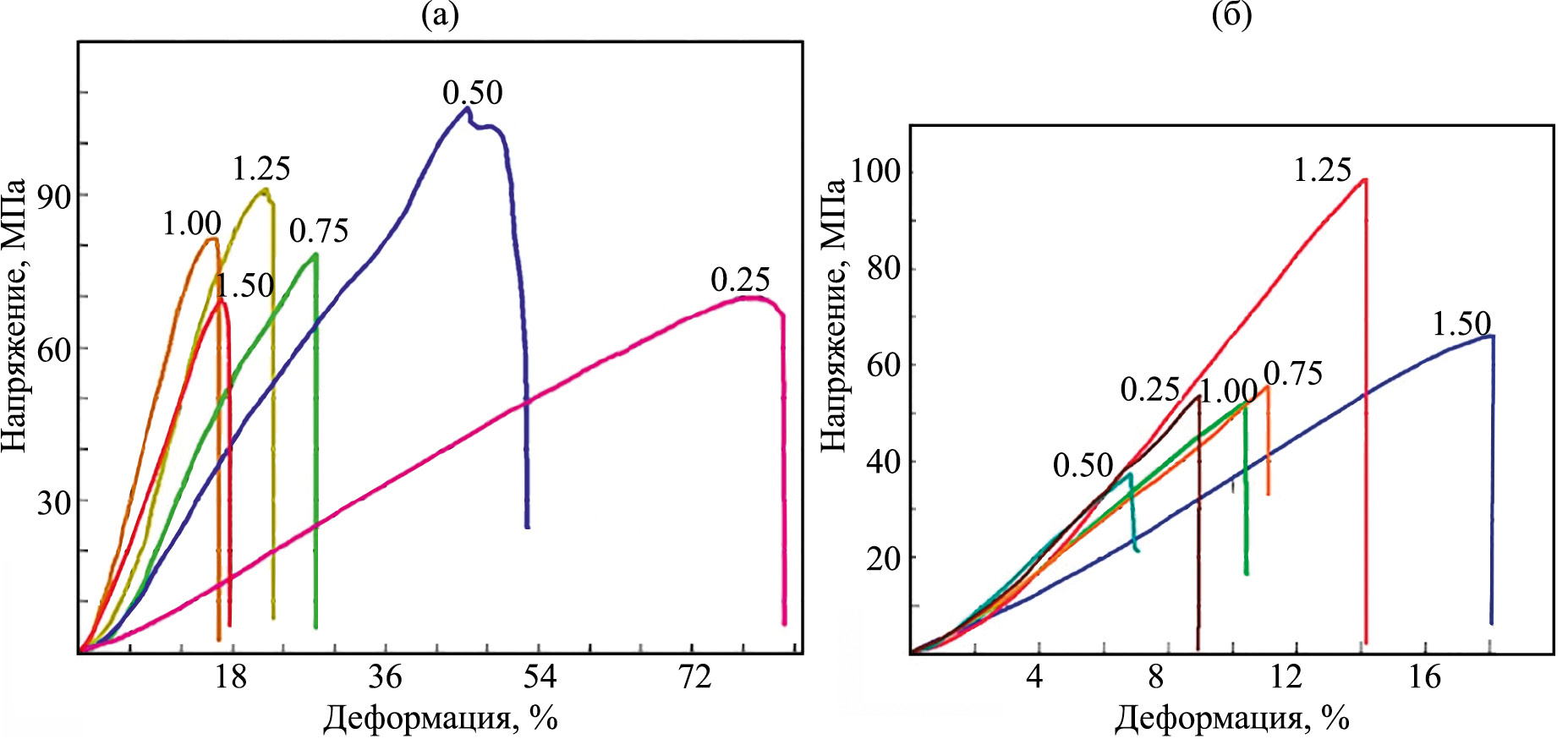 Рис. 2. Деформационные кривые при срезе на воздухе при комнатной температуре образцов дентина зубов человека различной толщины: (а) – выдержка в воде 24 часа; (б) – после приготовления.
