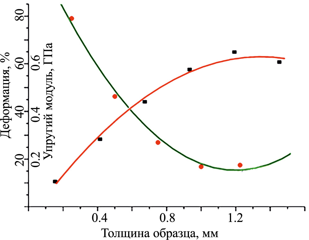 Рис. 4. Зависимость механических свойств дентина интактных зубов человека, выдержанного в воде в течение 24 часов, при срезе от толщины образца: красная кривая – упругий модуль, зеленая кривая – деформация до разрушения.