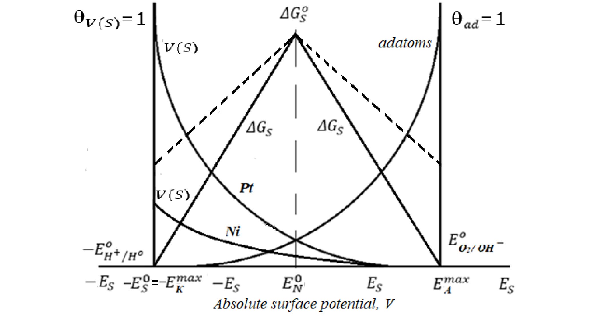 Внимание современных исследователей привлекают вопросы “активных центров” [6] и “активных мест” [7], определяющих по Тейлору [8] скорость катализа. В реальном процессе возможно одновременное действие обоих факторов. Однако учесть одновременное влияние на ЭК-процесс промежуточных частиц в электрохимических реакциях, активных центров и мест на поверхности металлов представляет сложную задачу. Целесообразно разделить влияние этих факторов, решая вопросы теории раздельно. В предложенном подходе к ЭК-процессу используются физикохимические модели, которые оперируют с исходной идеальной решеточной структурой металла в вакууме или в инертном газе, а сам электрохимический процесс рассматривается как процесс идеальной поляризации. Такой подход позволяет использовать термодинамику Гиббса поверхности металла [9], которая предусматривает образование поверхностной фазы со свойствами, отличающимися от свойств объемной фазы. В современной литературе используются (см. п.2): уравнение Гиббса для поверхностной энергии или уравнение Гельмгольца [10], пренебрегая изменением объема поверхностного слоя для монослоя атомов: