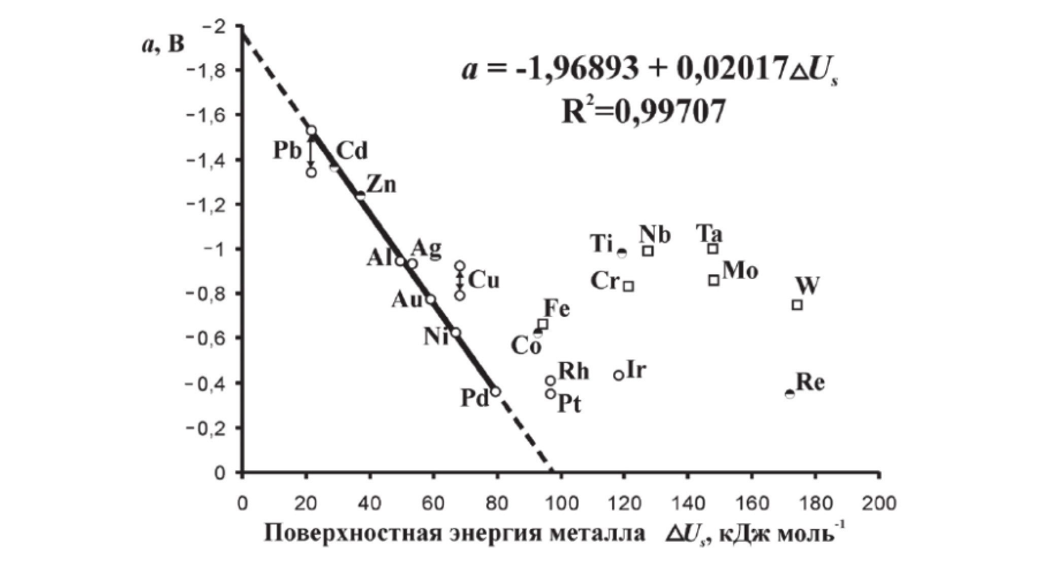 Рис. 4. Величина перенапряжения водорода a = logi0,H по данным Trassatti [16] относительно минимальной поверхностной энергии металла ΔUS с кристаллической структурой ГЦК по Vitos [11].