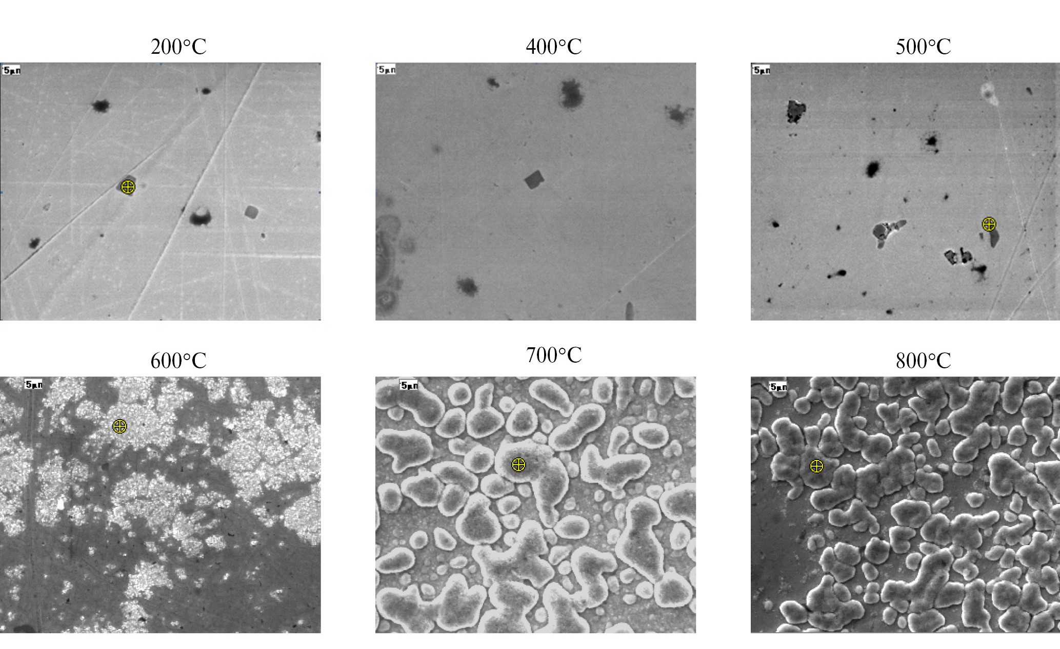 На рис. 2 приведены электронно-микроскопические изображения образцов стали после часовых циклов оксидирования при различных температурах. Видно, что при температурах до 400°С на поверхности регистрируются в основном макродефекты. При температуре 500°С на отдельных участках поверхности регистрируется появление редких мелкозернистых очагов, представляющих очевидно зародыши новой оксидной фазы (что подтверждается энергодисперсионным анализом). С ростом температуры оксидирования (с 500° до 600°С) на различных участках поверхности наблюдается формирование выраженных островков оксидных микрозерен, очевидно за счет тангенциального роста и заполнения имми поверхности.