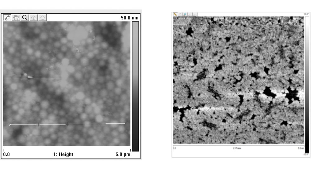 На рис. 2 представлена микрофотография и фазовая структура поверхности латексной полимерной пленки, представляющая собой контактирующие между собой монодисперсные частицы латекса.