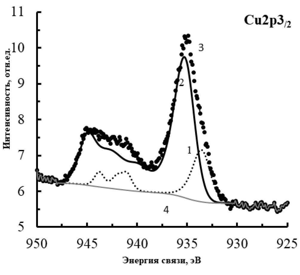 Рис. 3. Данные РФЭС для меди Cu2p3/2: 1 – CuО; 2 – Cu(OH)2; 3 – суммарная кривая; 4 – фон [24].
