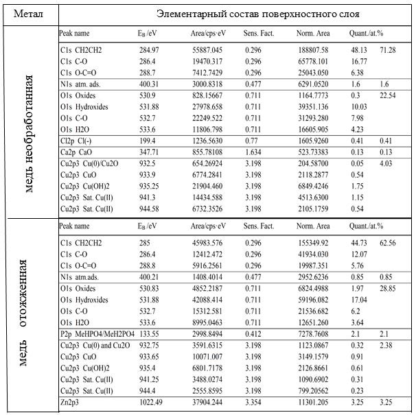 Элементарный состав поверхностного слоя металлических подложек необработанной и отожженной меди проводили с применением метода рентгеновской фотоэлектронной спектроскопии РФЭС на спектрофотометре Омикрон (Германия) [19].