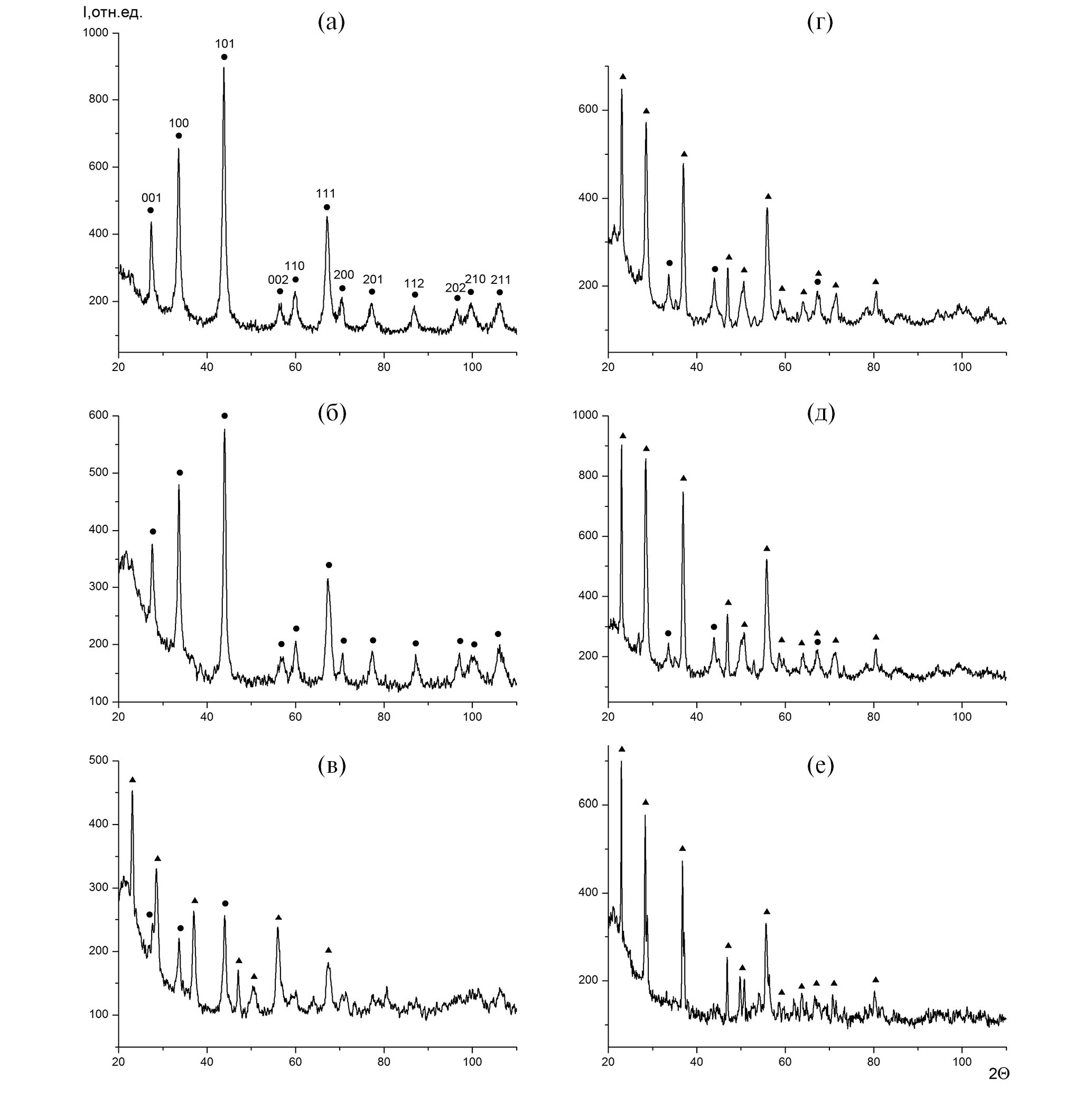 Рис. 1. Дифрактограммы исходных наночастиц TaB2 диаметром ~70 нм (а) и продуктов их окисления кислородом воздуха в изотермическом режиме при температурах ٥00° (б), 550° (в), 600° (г), 650° (д) и 1000°С (е). Символы обозначают TaB2 и Ta2O5 соответственно