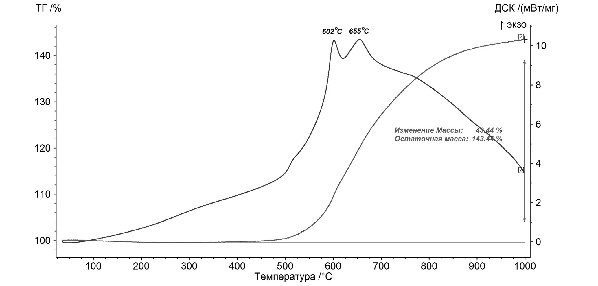 Рис. 2. Результаты термического анализа окисления кислородом воздуха наночастиц TaB2 диаметром ~70 нм в политермическом режиме от 20° до 1000°С.