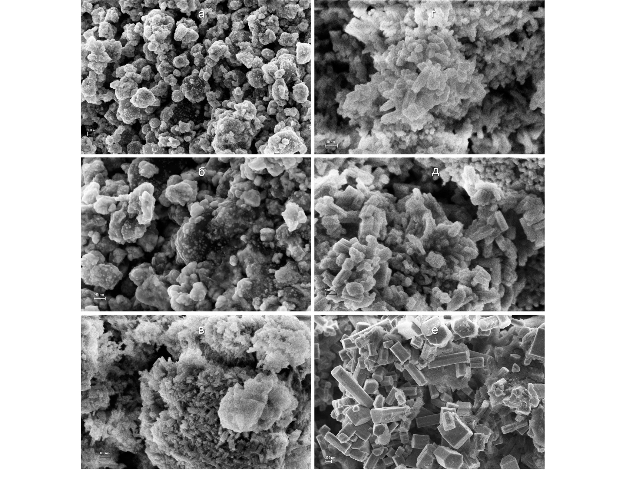 Рис. 4. Электронные микрофотографии исходных наночастиц TaB2 диаметром ~70 нм (а) и продуктов их окисления кислородом воздуха в изотермическом режиме при температурах 500°С (б), 550°С (в), 600°С (г), 650°С (д) и 1000°С (е).