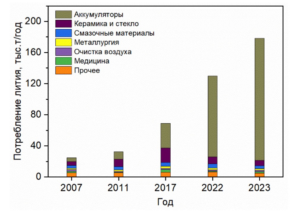 Отработавшие литий-ионные аккумуляторы являются перспективным вторичным источником лития, кобальта, никеля, меди и некоторых других элементов. На текущий момент наиболее ценными элементами являются Li и Co. За период с 2007 по 2023 годы потребление лития выросло с 25 тысяч тонн в год до 180 тысяч тонн в год (рис. 1). Доля лития, используемого для производства аккумуляторов, росла практически линейно – с 20% до 87% [1].