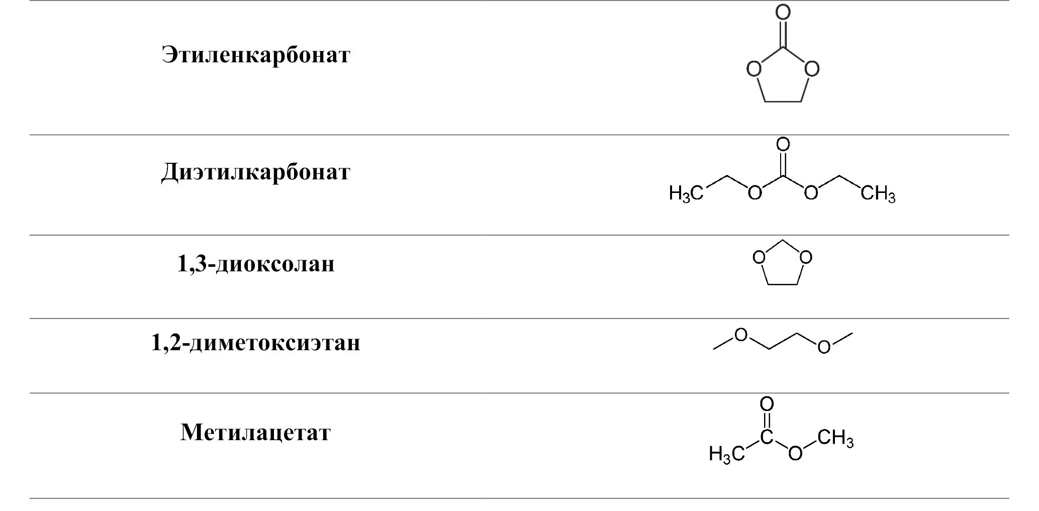Литий-ионный аккумулятор состоит из катода, анода, сепаратора, электролита, которые помещены в герметичный корпус. В качестве материалов корпуса используют нержавеющую сталь, алюминий и пластик, в качестве электролита – смеси органических полярных растворителей (рис. 2) и различные соли лития (LiPF6, LiClO4 и т.д.). Материалом сепаратора могут быть полиэтилен, полипропилен, политетрафторэтилен, поливинилиденфторид, поливинилхлорид.