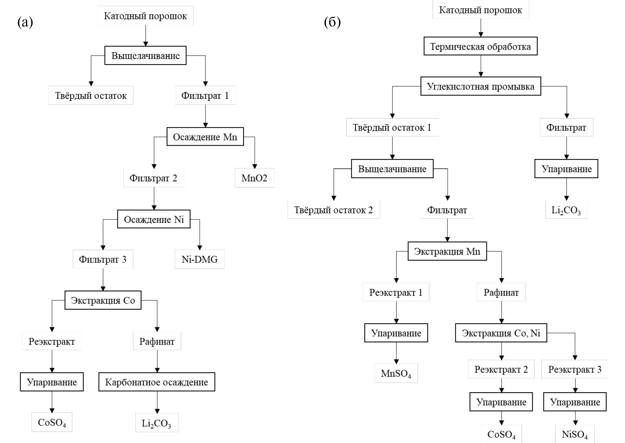 Типичный процесс разделения и извлечения ценных компонентов аккумуляторов схематически показан на рис. 3(а) [19]. В качестве осадителей Mn, Ni и Li используются перманганат калия (KMnO4), диметилглиоксим (C4H8N2O2) и карбонат натрия (Na2CO3) соответственно, а для извлечения Co обычно применяется гидроксид натрия (NaOH) или экстракция раствором Cyanex 272. Другой типичный пример показан на рис. 3(б) [25], который включает предварительную термообработку катодного порошка обжигом с восстановителем. В ходе предварительной обработки образуются карбонаты и оксиды металлов, из которых селективно выщелачивается Li с помощью воды, насыщенной углекислым газом. Затем Mn экстрагируется раствором Д2ЭГФК, а Co и Ni последовательно экстрагируются раствором РС-88А при различных значениях рН. В результате после упаривания реэкстрактов были получены сульфатные продукты NiSO4, CoSO4 и MnSO4.