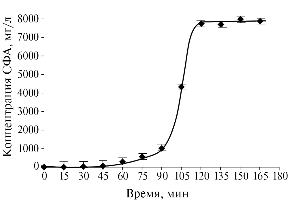 Рис. 2. Зависимость концентрации сульфаниламида на выходе из колонки от времени.