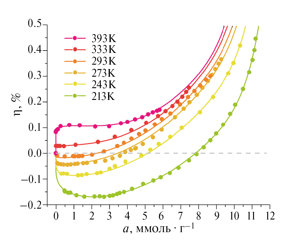Перед каждым экспериментом адсорбент регенерировали при температуре 573 К и давлении менее 0.1 Па. Относительную линейную деформацию адсорбента, η [%], рассчитывали по формуле: