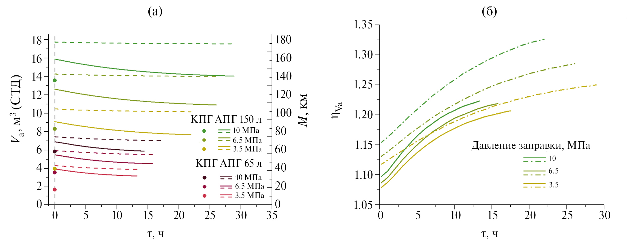 Представленная система уравнений (11)-(13) решалась с использованием последовательных приближений на каждом временном шаге, размер которого определялся пропорционально скорости протекающих процессов (удельный расход газа при заправке и выдаче, перепад температур при стабилизации параметров P и T), а также с учетом коэффициента теплообмена с внешней средой для обеспечения пренебрежимо малой математической погрешности в процессе вычислений.