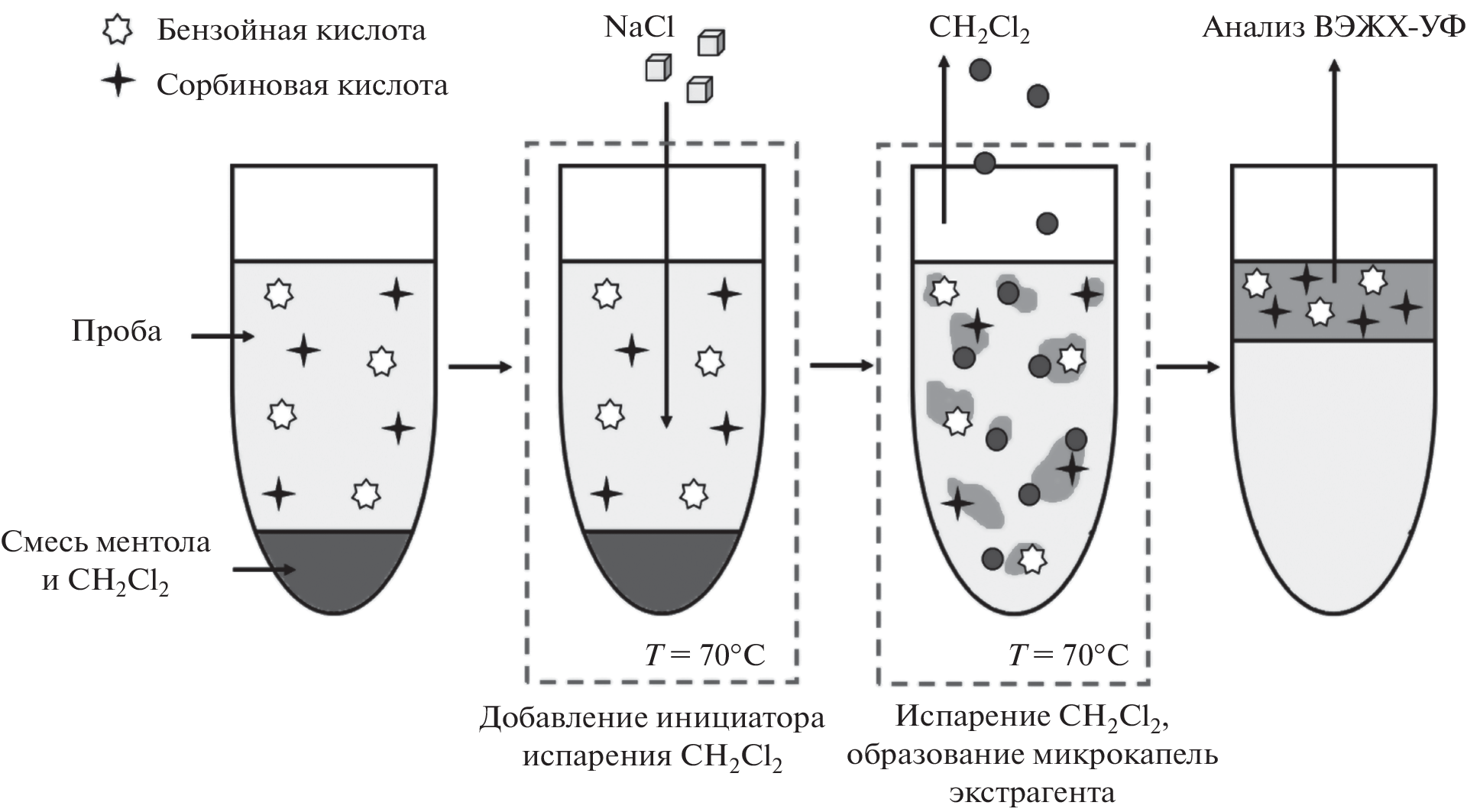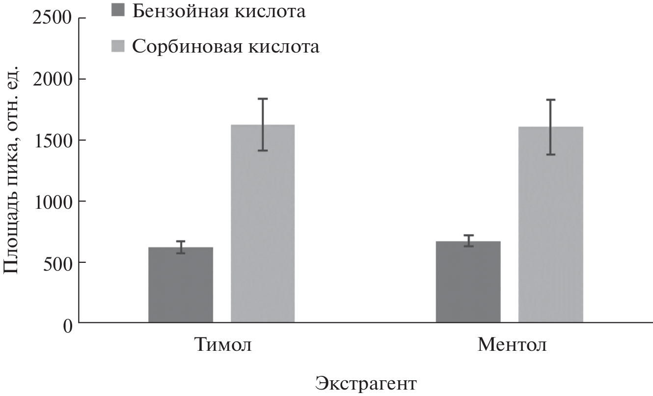 A method of dispersive liquid–liquid microextraction, based on the dispersion of an extractant by the gas phase formed as a result of a phase transition, i.e., the evaporation of a highly volatile nonpolar organic solvent (dispersant) upon heating the extraction,—is developed. The analytical capabilities of the method are shown in the determination of preservatives (sorbic and benzoic acids) in soft drinks for baby food by high-performance liquid chromatography with photometric detection. The extractant and the dispersant for the microextraction of preservatives are chosen a terpenoid and a highly volatile organochlorine solvent, respectively, which excluded the use of polar organic solvents for dispersing phases, with which the distribution coefficients are reduced. The limits of detection (3σ) for sorbic and benzoic acids are 0.3 mg/L. The developed method does not require centrifugation for phase separation