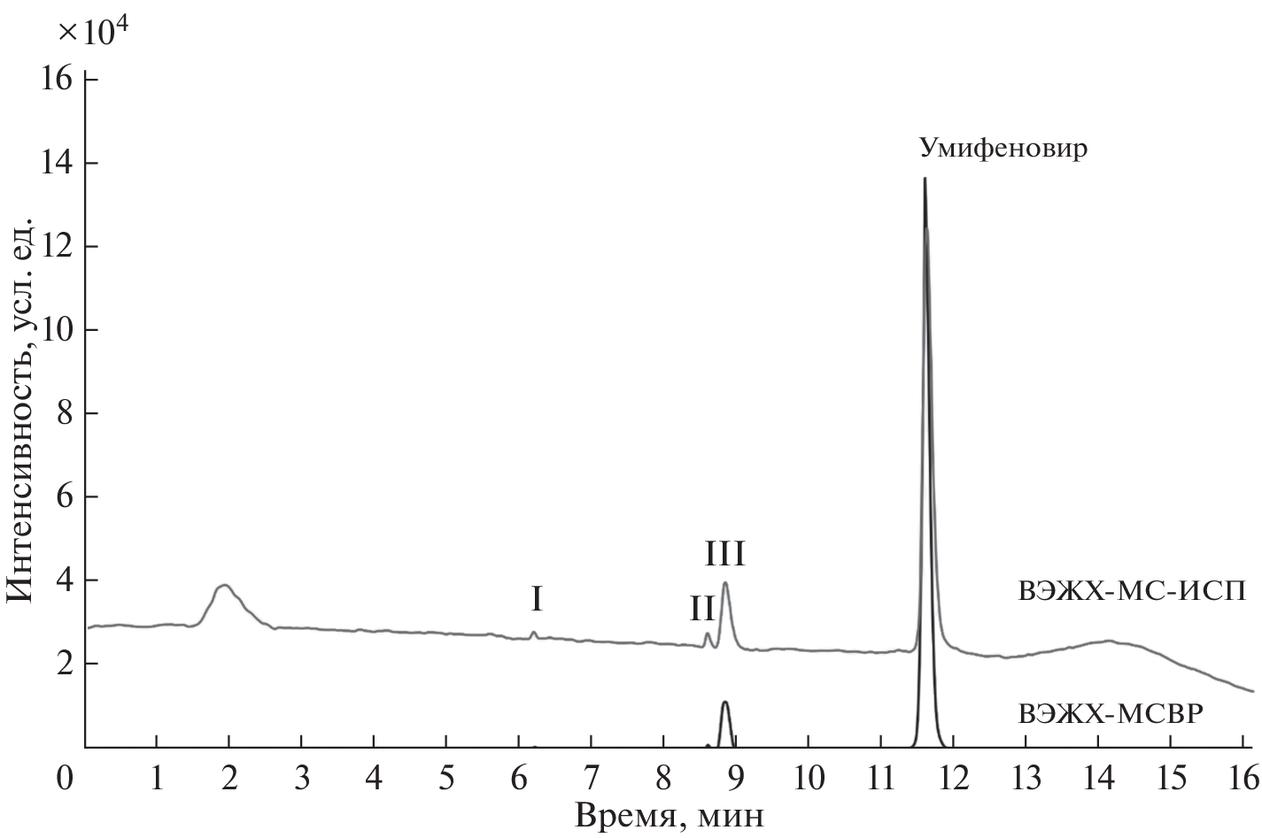 An approach to the highly sensitive and selective determination of the bromine-containing antiviral drug umifenovir (Arbidol) and its metabolites in natural and waste water, activated sludge, and bottom sediments by chromatography-mass spectrometry based on a combination of two techniques– inductively coupled plasma mass spectrometry (ICP MS) and electrospray ionization high-resolution mass spectrometry (ESI HRMS) is developed. Reversed-phase chromatographic separation and detection based on ESI HRMS provide the reliable detection and identification of analytes in complex matrices, while the use of ICP-MS with 79Br signal detection makes it possible to exclude matrix effects and use a single analytical standard for quantitative analysis. The use of solid-phase extraction and pressurized liquid extraction as sample preparation methods made it possible to achieve limits of detection at a level of 0.2 ng/L and 2 µg/kg for liquid and solid samples, respectively. The developed approach was successfully tested in the analysis of real samples. It is shown that the concentrations of analytes in urban wastewaters are in the range 4.4–260 ng/L. The highest concentration (up to 3.7 mg/kg) is characteristic of activated sludge, which acts as an effective sorbent for umifenovir and its transformation products.