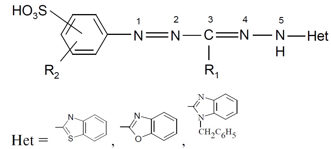 Органические соединения класса гетарилформазанов общей формулы, приведенной на схеме 1, представляют значительный интерес при применении их в качестве хромофорных реагентов благодаря сочетанию единой сопряженной азогидразонной группировки и высокой вариабельности заместителей, вводимых в состав при синтезе [1–5]. Наличие HSO3-группы в составе реагента обеспечивает растворимость синтезированных сульфосодержащих формазанов в органических растворителях и даже в воде, что позволяет использовать матрицы разной природы, в то время как присутствие гидроксигруппы R2 способствует проявлению селективности при комплексообразовании.