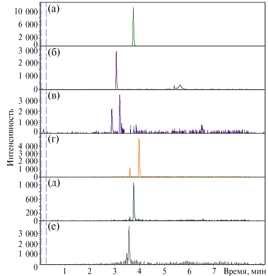 Рис. 1. Хроматограмма по выделенным ионам образца мочи после употребления ибутаморена. m/z: (а) 529.2479, (б) 439.2010, (в) 455.1959, (г) 545.2428, (д) 561.2377, (е) 577.2323.